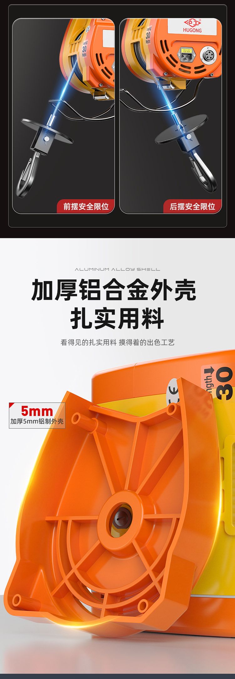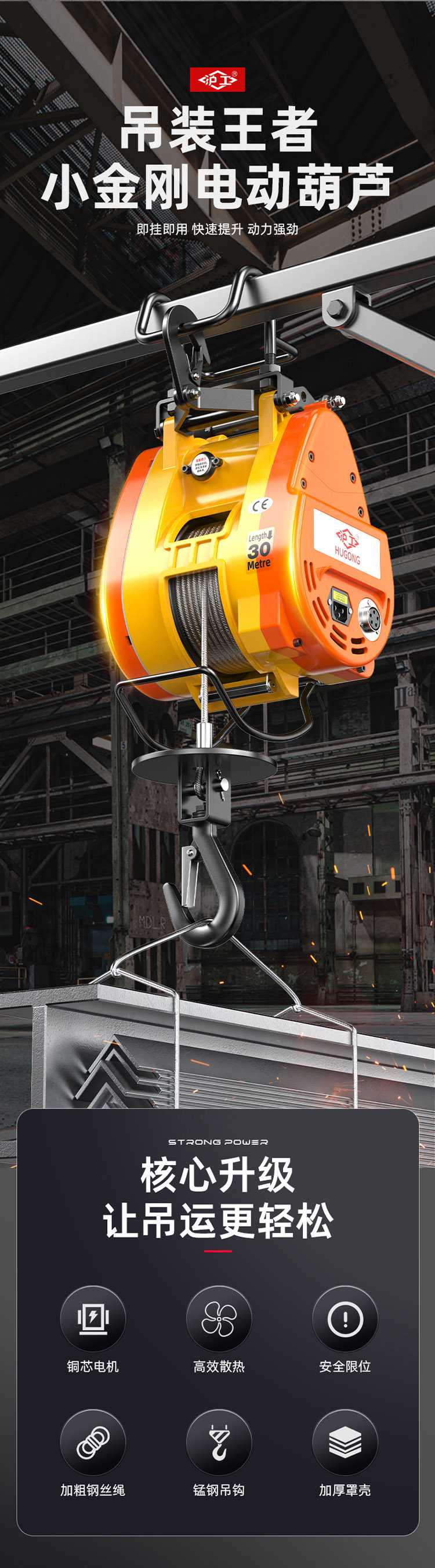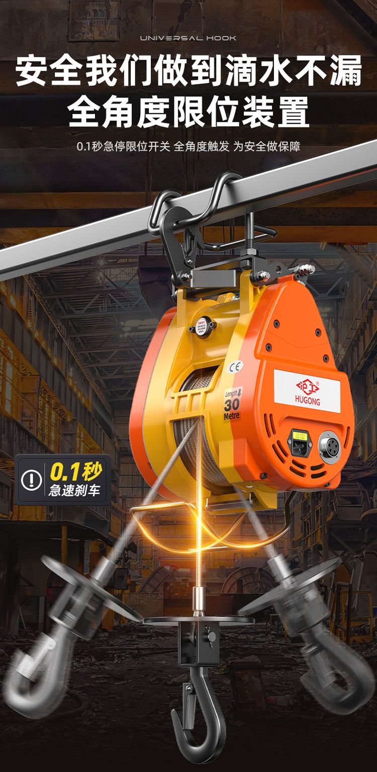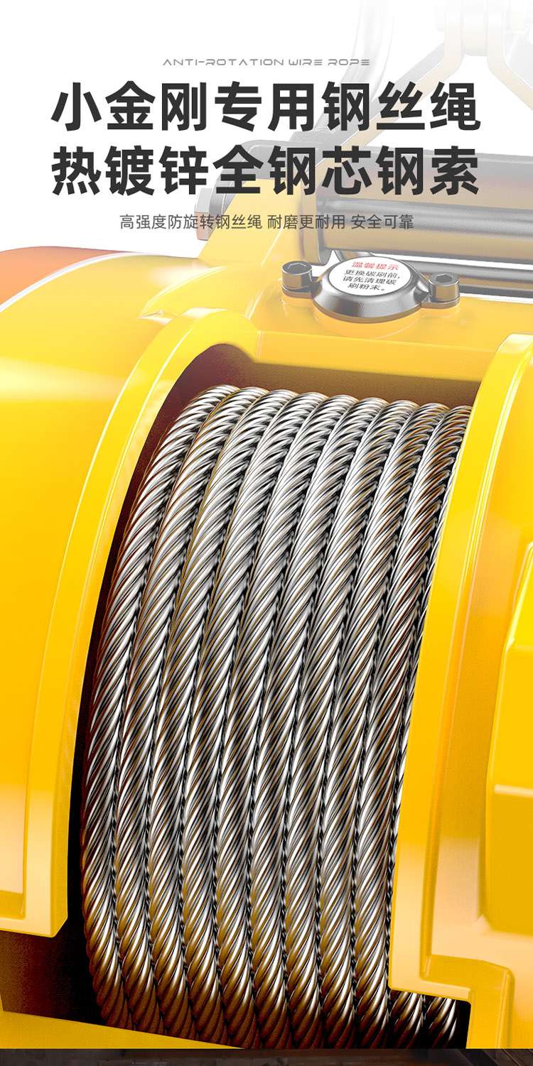 小金剛電動葫蘆,純銅電機,強勁動力。功率高達1800W。全角度限位裝置,小金剛專用鋼絲繩,熱鍍鋅全鋼芯鋼索。