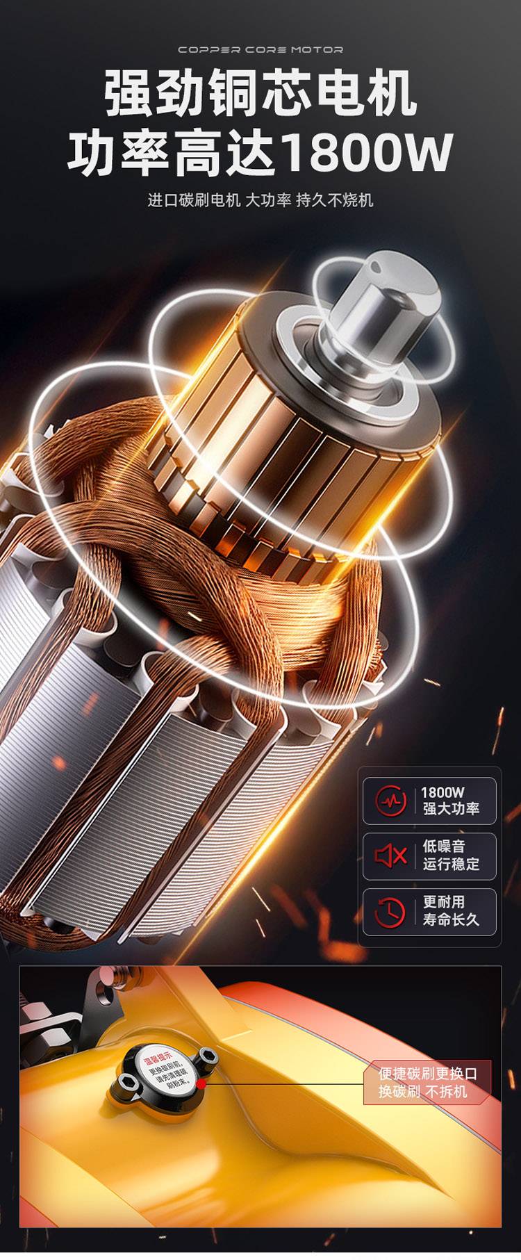 ● 進口碳刷電機,大功率,持久不燒機;