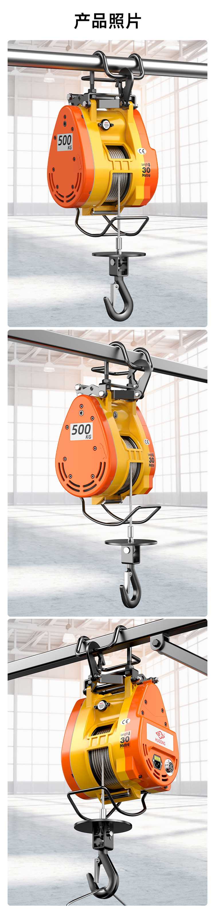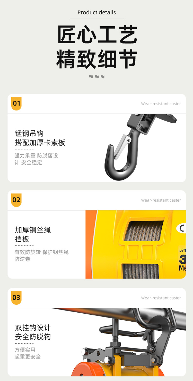 ● 高強度防旋轉鋼絲繩,耐磨更耐用,安全可靠;