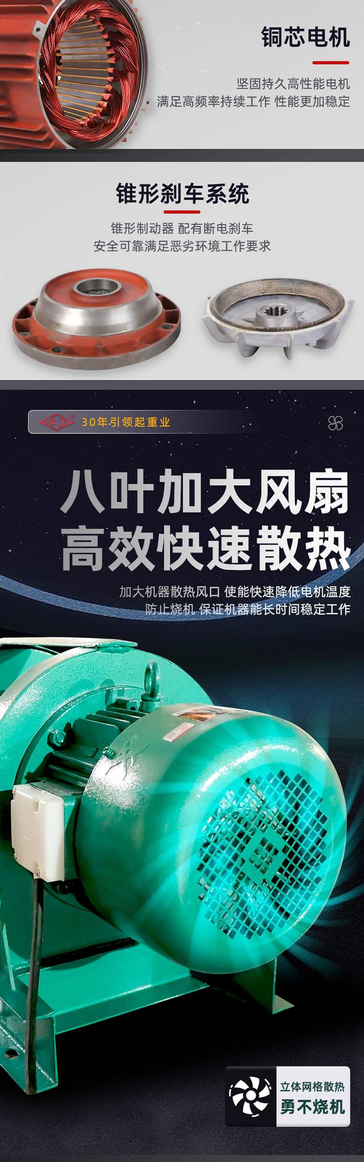 ● 斷電自動剎車,大功率銅芯電機(jī),大尺寸散熱風(fēng)扇;