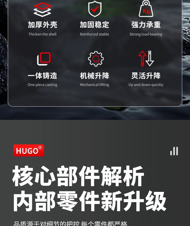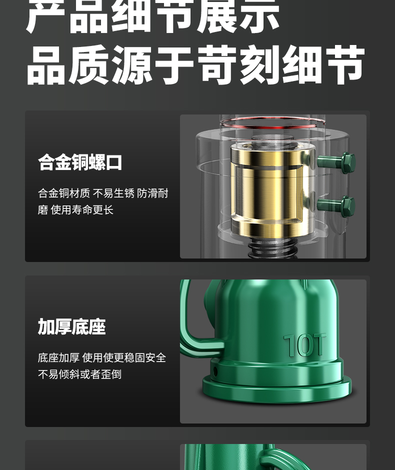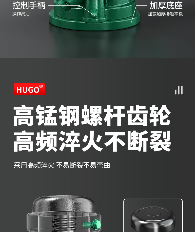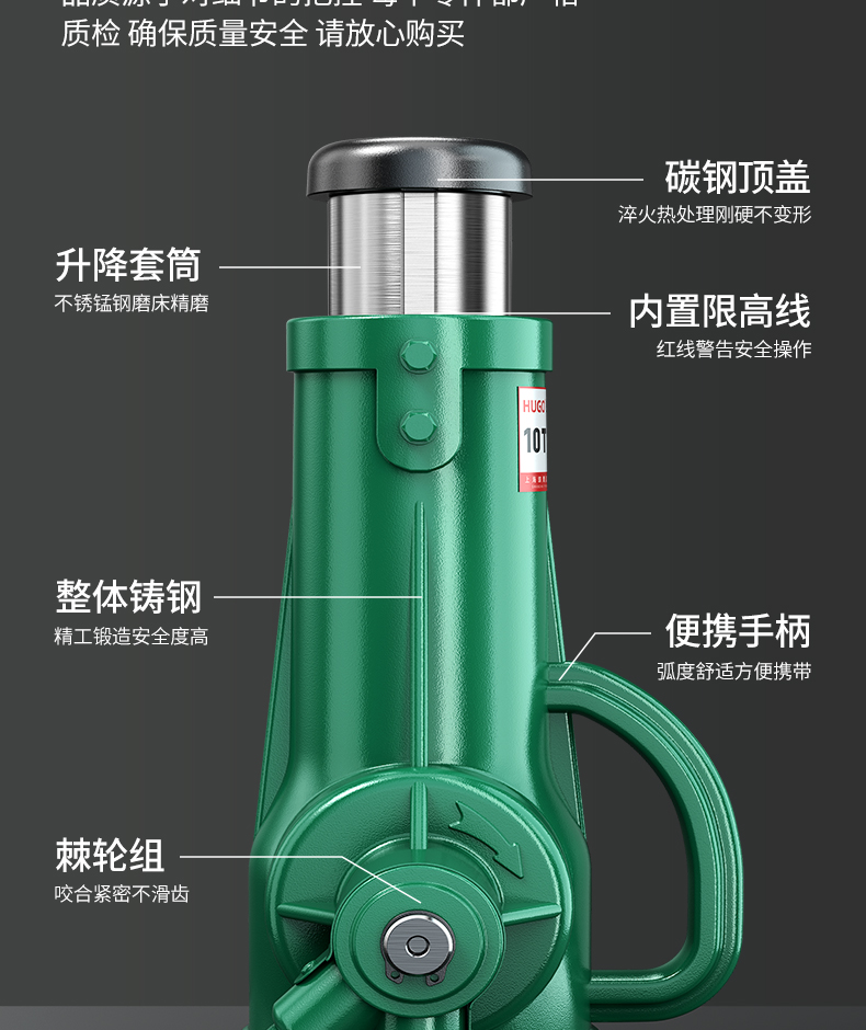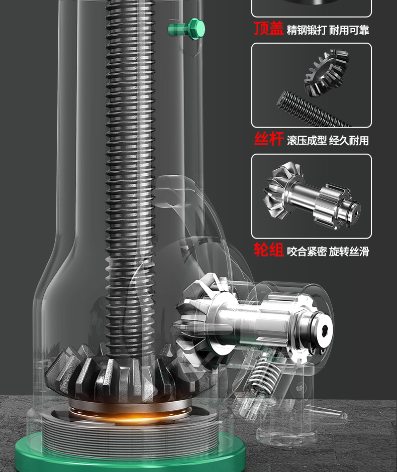 "螺旋千斤頂采用高頻淬火高錳鋼螺桿齒輪,不易斷裂不易彎曲。球墨鑄鐵一體成型,保證定身結(jié)構(gòu)穩(wěn)定耐磨拒絕外貼鐵皮。45#錳鋼升降套筒,強(qiáng)壓不易變形,穩(wěn)固硬度高,操作更安全"