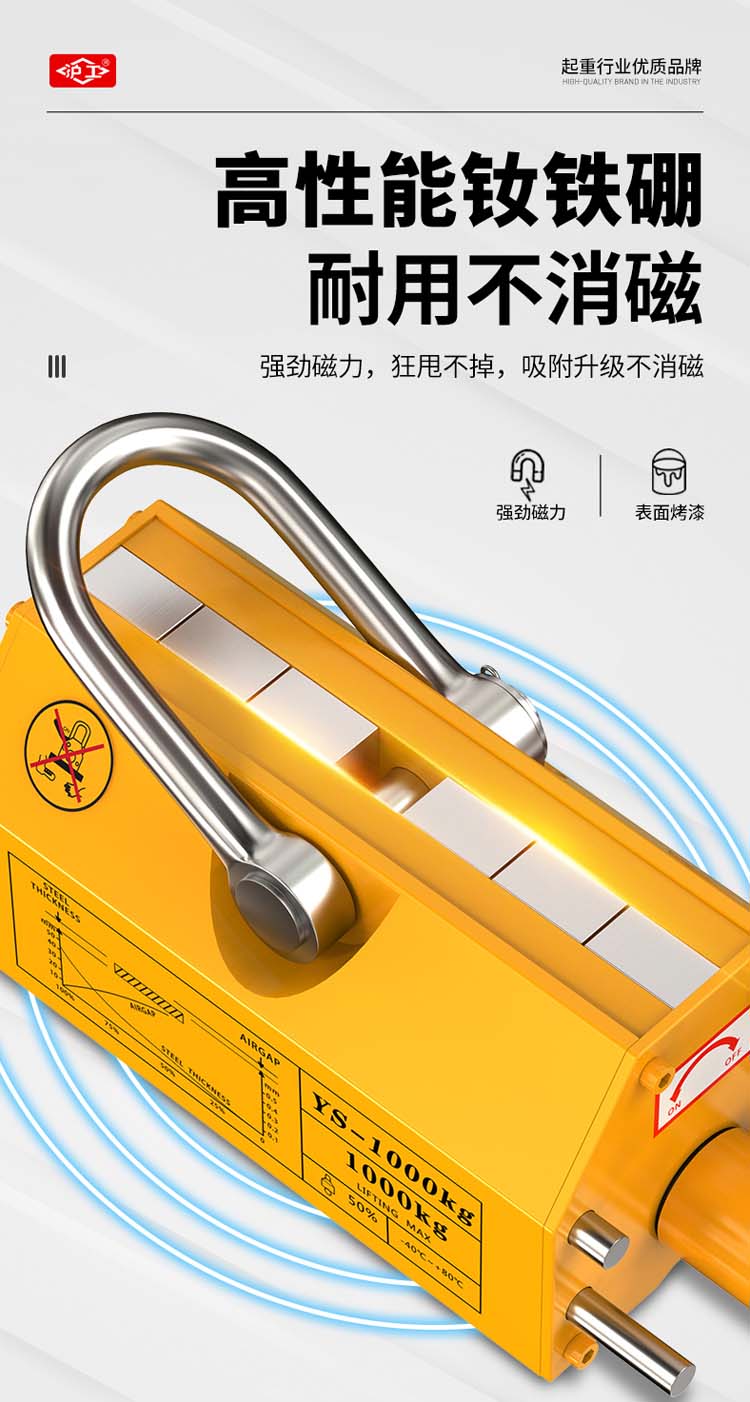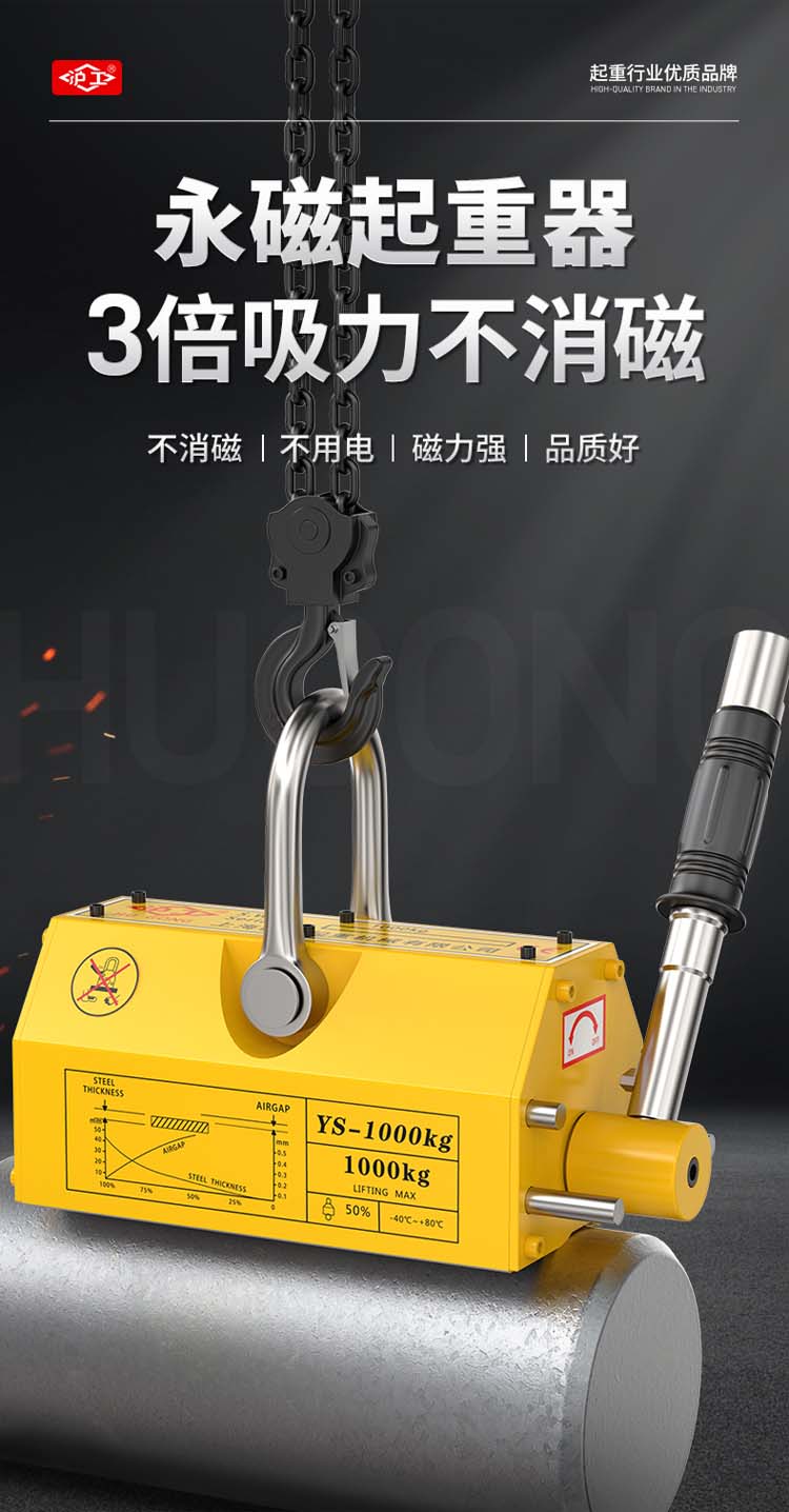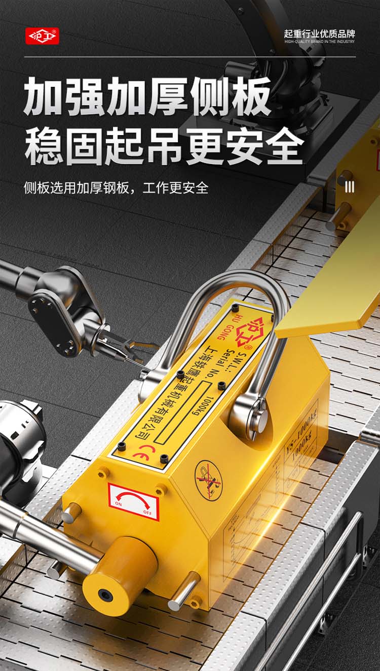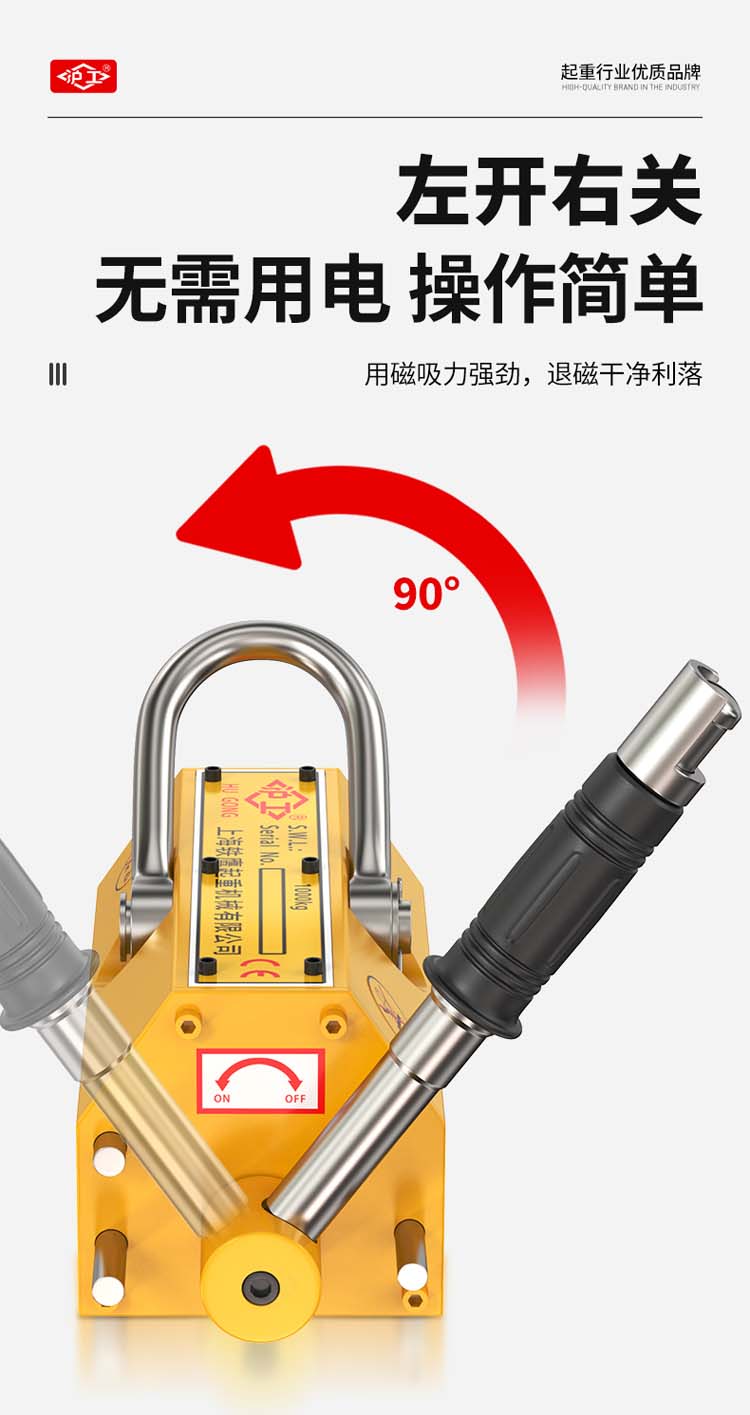磁力吊廣泛用于倉庫和作業現場的鋼材的起重搬運,工作機械的移動。尤其適用于機械加工過程中對 工件的上下移動及周轉。 本產品特點休積小、吸持力大,手動型需轉動把手即可實現吸、棄鐵。安全節能,磁力恒久不衰,本產品根據不同型號,可吸吊 20一5000公斤的鋼鐵物件。