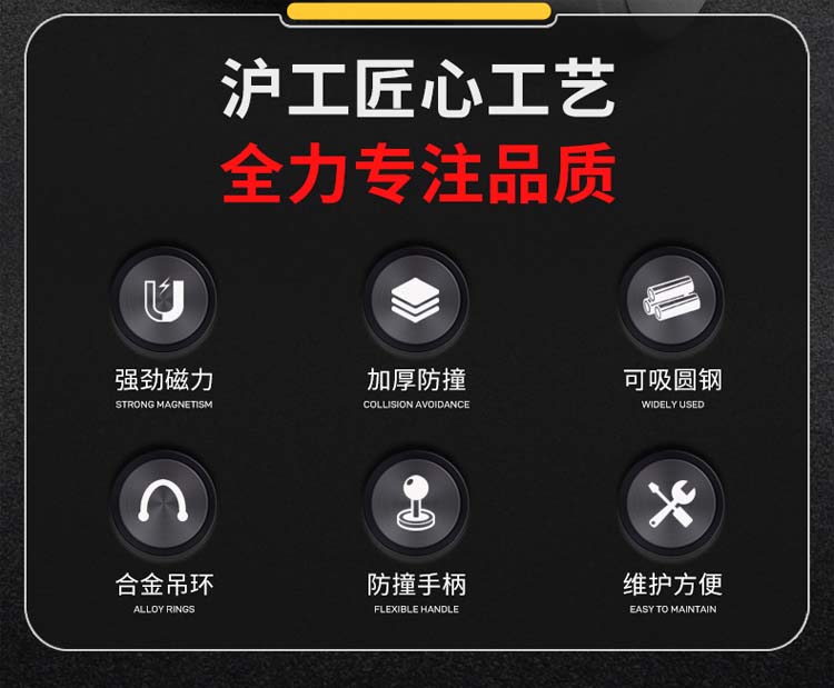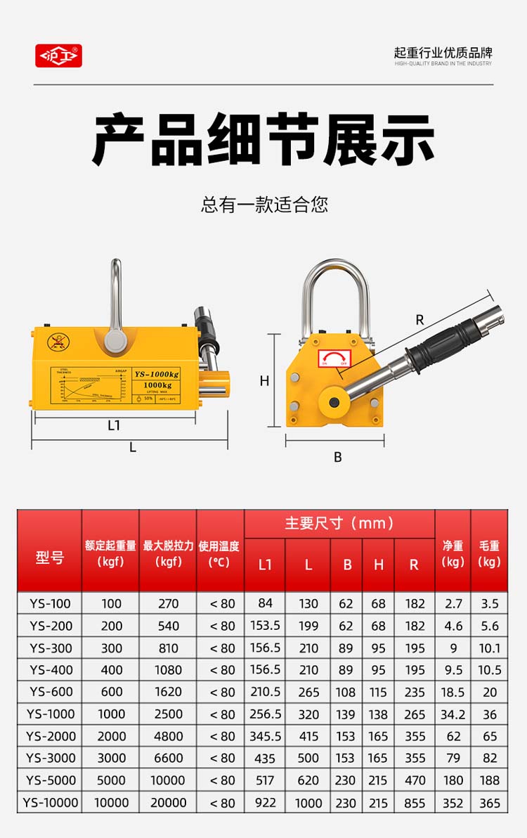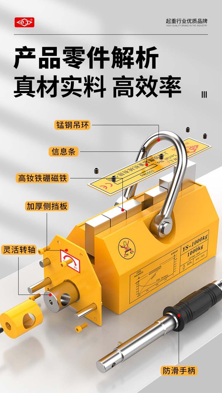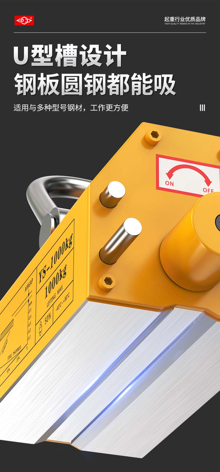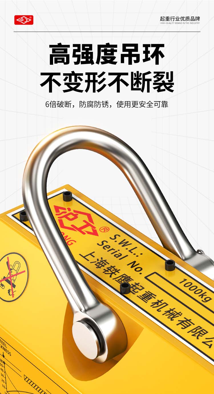 磁力吊廣泛用于倉庫和作業現場的鋼材的起重搬運,工作機械的移動。尤其適用于機械加工過程中對 工件的上下移動及周轉。 本產品特點休積小、吸持力大,手動型需轉動把手即可實現吸、棄鐵。安全節能,磁力恒久不衰,本產品根據不同型號,可吸吊 20一5000公斤的鋼鐵物件。